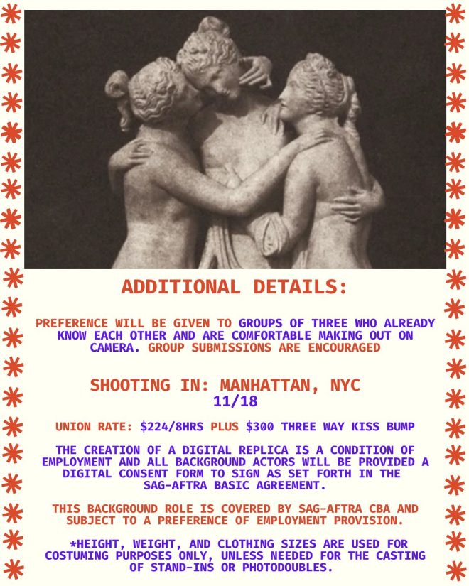 PLEASE CONFIRM YOU ARE COMFORTABLE KISSING AND/OR HAVE INTIMATE CONTACT ON CAMERA WITH 2 OTHER BACKGROUND ACTOR