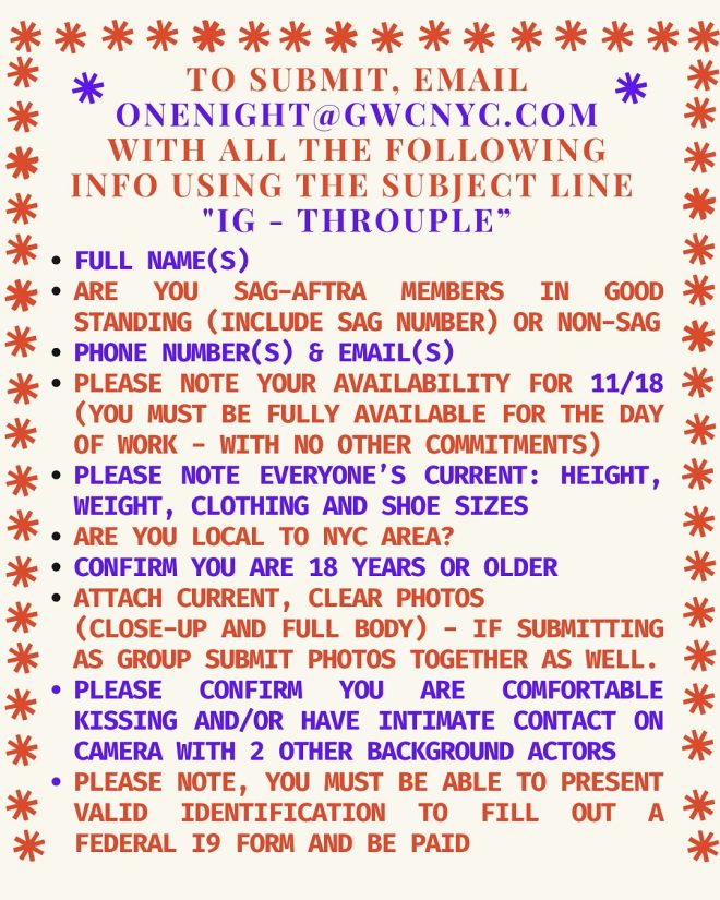 TO SUBMIT, EMAIL ONENIGHT@GWCNYC.COM WITH ALL THE FOLLOWING INFO USING THE SUBJECT LINE “THROUPLE”