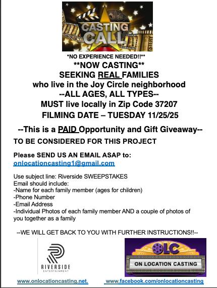 [FAMILIES] Male and Female, all ethnicities, age range 0-70, ALL types. MUST LIVE WITHIN THE ZIP CODE of 37207 (Joy Circle area of Nashville)