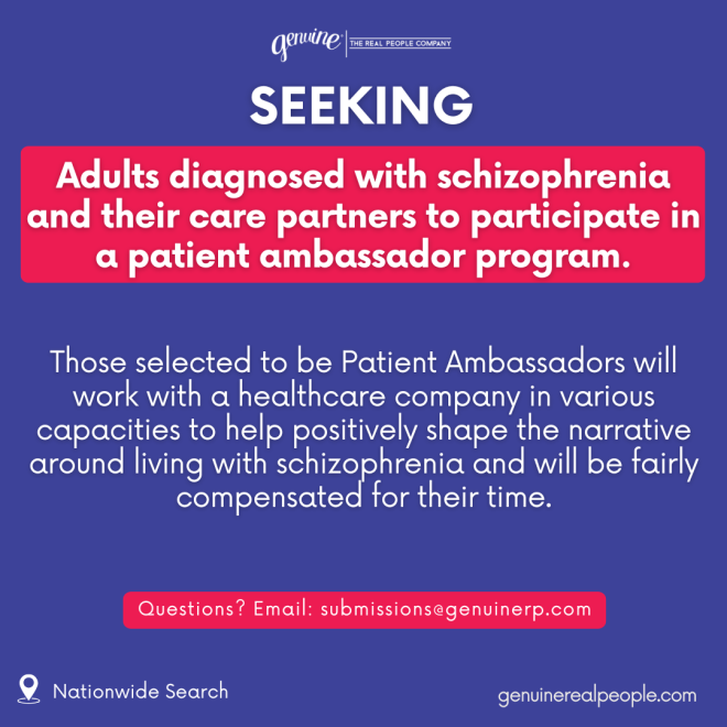 GENUINE is conducting a nationwide search for adults diagnosed with schizophrenia, as well as their care partners, to participate in a meaningful patient ambassador program.