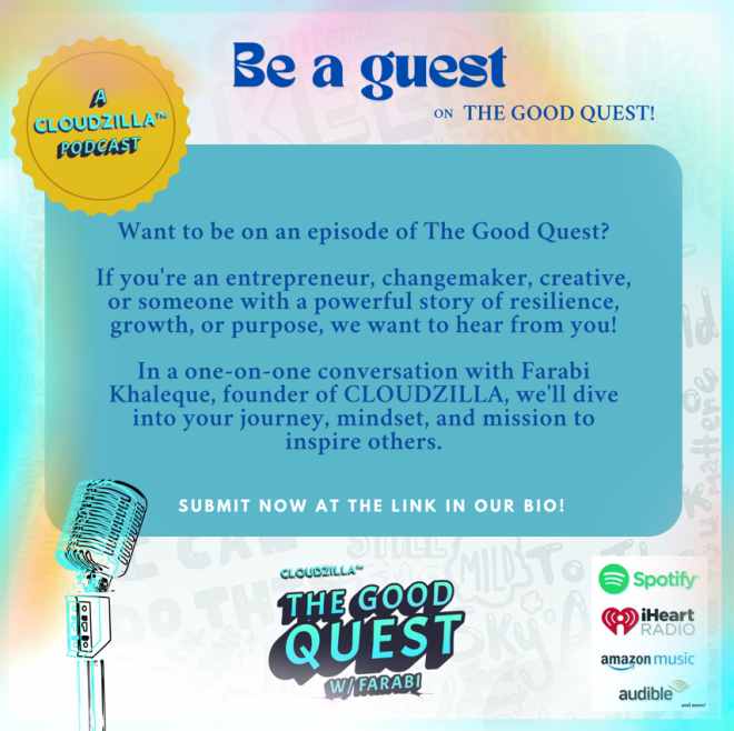 The Good Quest is a brand new CLOUDZILLA Original Podcast hosted by Farabi Khaleque, founder of the award-winning health and wellness brand, CLOUDZILLA. Known for its mission to empower Gen Z through storytelling, mindset, and mental health awareness through different initiatives.