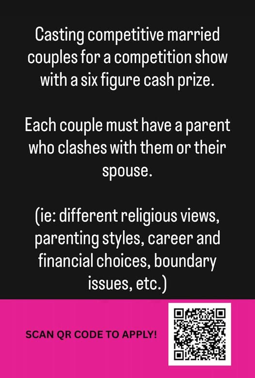 Casting competitive married couples for a competition show with a six figure cash prize.