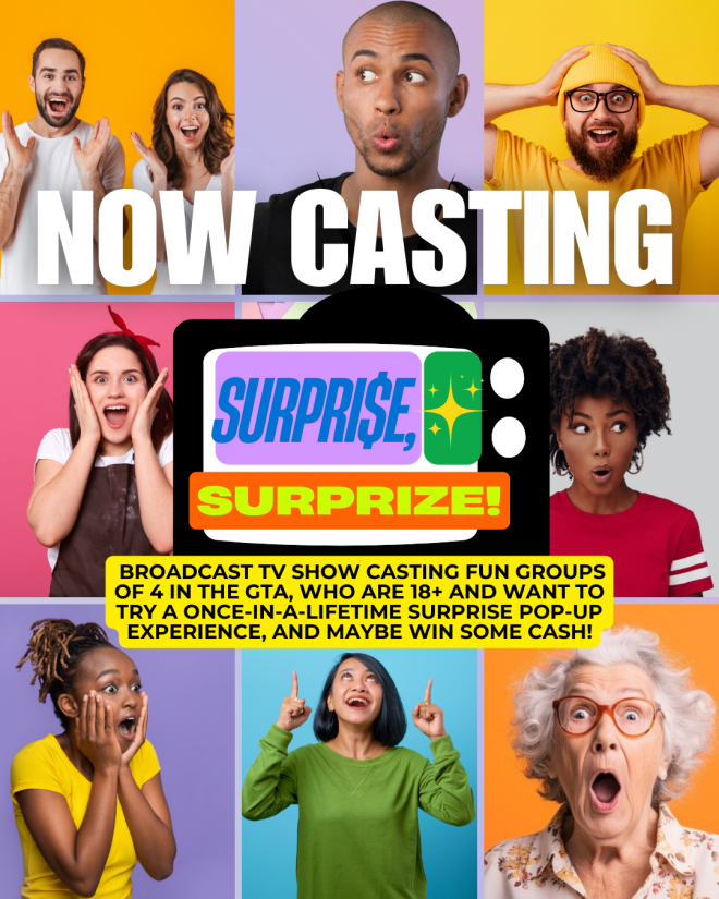 Well, SURPRI$E, SURPRIZE! We are casting a TV Series for a major broadcaster, and are looking for groups of 4, who are 18+ in the GTA, that want to embark on an exciting surprise pop-up experience, and maybe even win some cold, hard cash! Each group will attend a unique pop-up experience and be presented with an opportunity/challenge that can have you leaving a little richer, but there’s only one catch: you won’t know what it is until you get there! Think of it like a surprise party with money, but YOU and your group are the guests of honour!