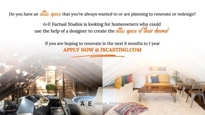 JS Casting. We’re working on an exciting new attic renovation show for A+E Factual Studios, and we’re looking for homeowners who need a designer’s help to transform their attic into a dream space! I’ve attached a flyer with more details.