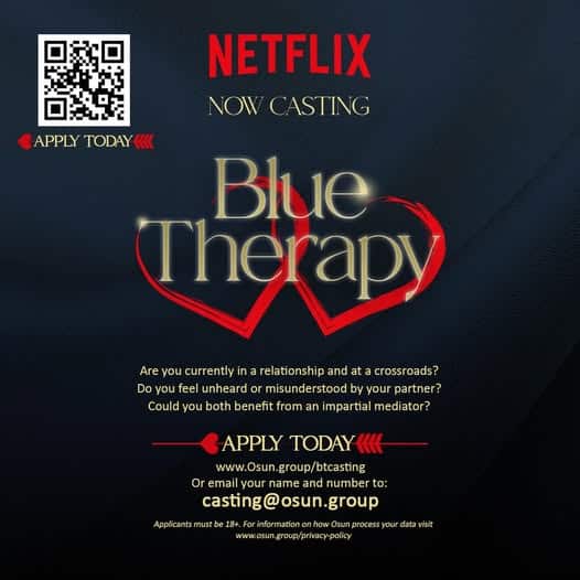 Netflix is bringing the hit reality series Blue Therapy to a global audience and is searching for couples at a crossroads who are ready to work through their relationship challenges with expert guidance.