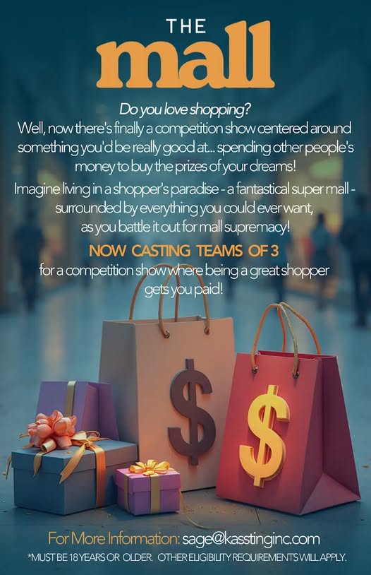 Get cast on “The mall” – a new reality competition series where people who love shopping get to compete… by spending other people’s money to potentially win prizes that are described as “Dream Prizes.”