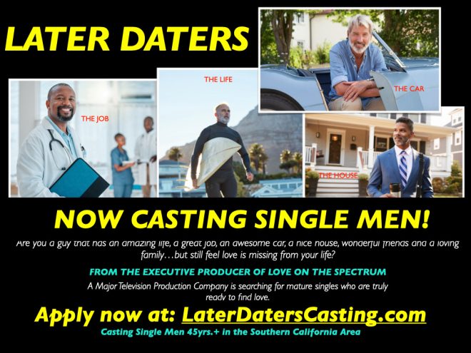 A major television production company is now casting single men and women, ages 45 and older, in the Los Angeles area for “Later Daters”, a heartwarming new project that celebrates mature love and second chances at romance.