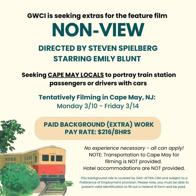 A Steven Spielberg movie will be filming in Cape May this March 2025 and the production is seeking Southern New Jersey locals to take part. GWCI is now casting to fill background extras roles to work on the movie set, on location in Cape May.