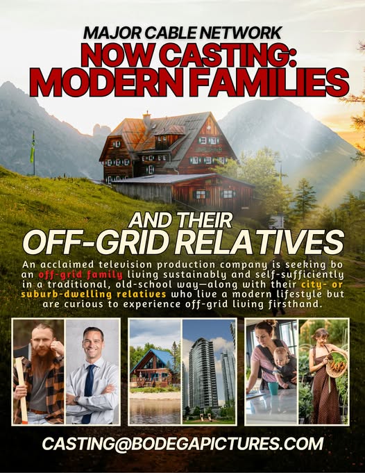 An acclaimed television production company in cooperation with a major cable network is looking for both an off-grid family living sustainably in a traditional, old-school way, and their modern relatives who are curious about experiencing off-grid life.
