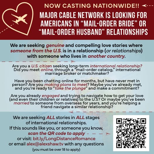 A new Major Network project is casting couples in international relationships. They are looking for individuals who have met their partner online, through an international matchmaker, or via a marriage broker and would like to share their journey.