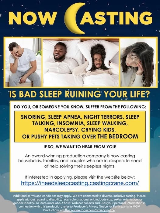An acclaimed production company is seeking households, couples, and families struggling with sleep issues for an upcoming project. If restless nights are affecting your daily life, this is your chance to get expert help!