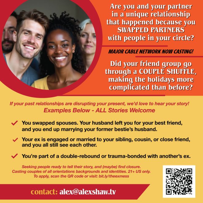 Seeking people ready to tell their story, and (maybe) find closure. Casting couples of all orientations backgrounds and identities. 21+ US only. To apply, scan the QR code or visit: bit.ly/theexmess