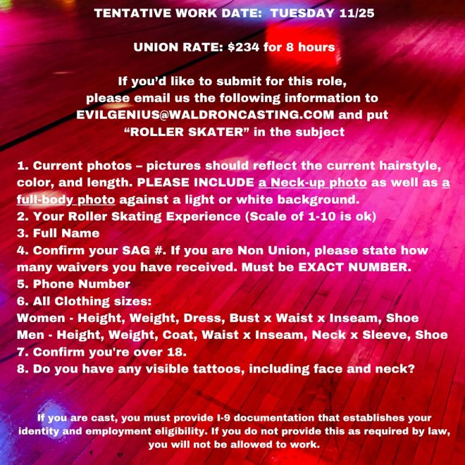 UNION RATE: $234 for 8 hoursIf you’d like to submit for this role, please email us the following information to EVILGENIUS@WALDRONCASTING.COM and put “ROLLER SKATER” in the subject