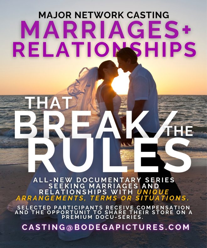 An acclaimed television production company in cooperation with a major cable network is casting a bold, ground-breaking documentary series exploring unconventional, non-traditional, and boundary-pushing marriage arrangements, setups, terms, and situations. We’re looking for couples who have unique agreements or arrangements—whether emotional, romantic, sexual, logistical, or lifestyle-based—that differ from traditional marriage. Whether they’ve always been part of your relationship or you’re just now adjusting the terms of your relationship, we want to hear your unique stories and situations.