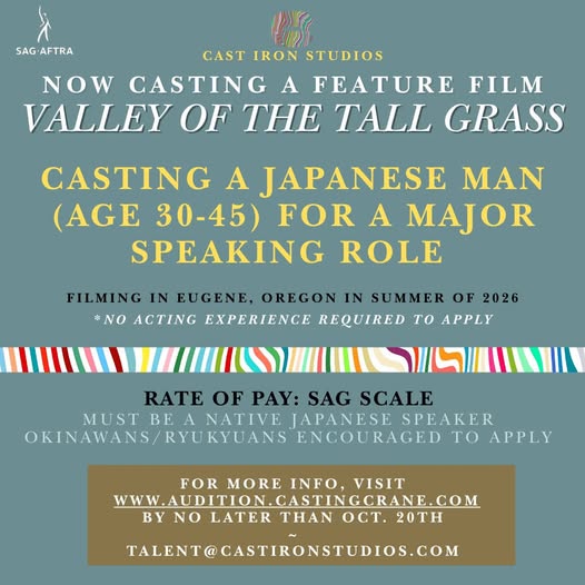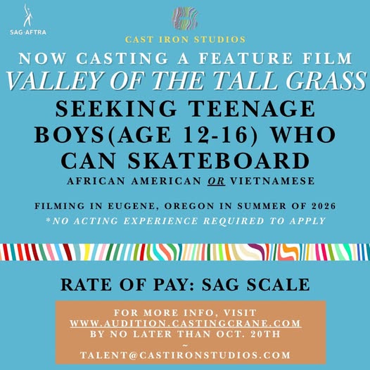 Cast Iron Studios, a Portland-based film and television casting office, is now seeking talent for the upcoming SAG-AFTRA feature film “Valley of the Tall Grass.”