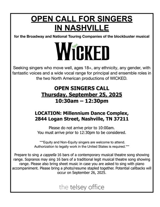 An open call is being held in Nashville for singers interested in joining the Broadway and national touring companies of Wicked.