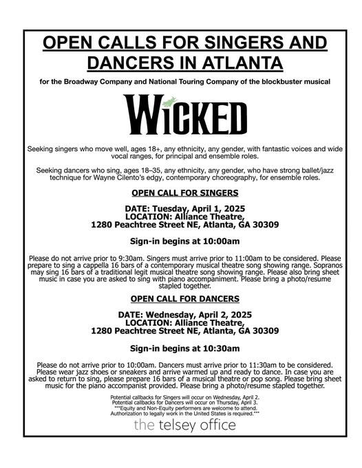 The Broadway and National Touring Companies of Wicked are holding open call auditions in Atlanta for singers on April 1, 2025. If you are an Atlanta area performer looking to audition for a major production, here is your chance.