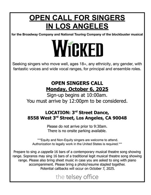 The Broadway show and the touring production of “Wicked” are hosting auditions for singers who would like to join the show. Open call will be held in Los Angeles next month. The production is seeking singers ages 18 and up, of all genders and ethnicities, with strong voices and a wide range for both principal and ensemble roles. Equity and non-Equity performers are welcome, but all must be legally authorized to work in the U.S.