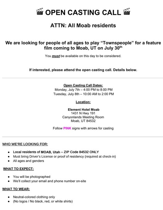 The casting team is seeking residents of Moab, ZIP code 84532 only, of all ages and genders. No acting experience is required, but participants must bring a valid driver’s license or other proof of Moab residency to check-in.