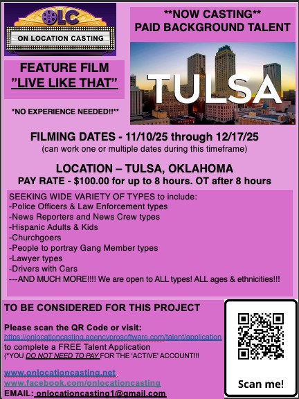 Do you want to be in a movie? Here is your chance. OLC announced that they are currently casting for talent to fill in a variety of paid background acting roles in Tulsa, Oklahoma.