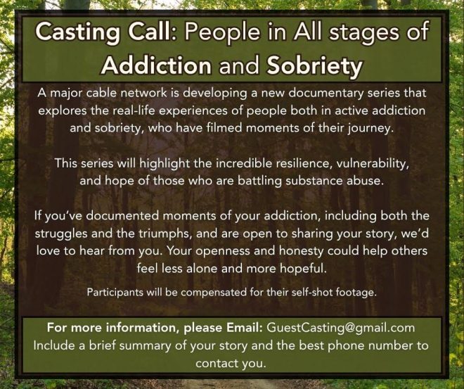 A major cable network is currently casting for a powerful new documentary series that aims to shed light on the personal and often unseen realities of addiction and the path to recovery. This project will feature real stories as told through the lens of those who have lived them. Production states they will be highlighting the emotional, raw, and inspiring moments of both active addiction and sobriety.