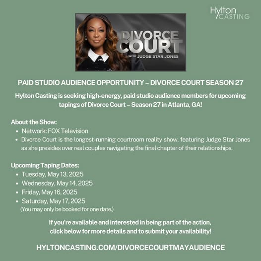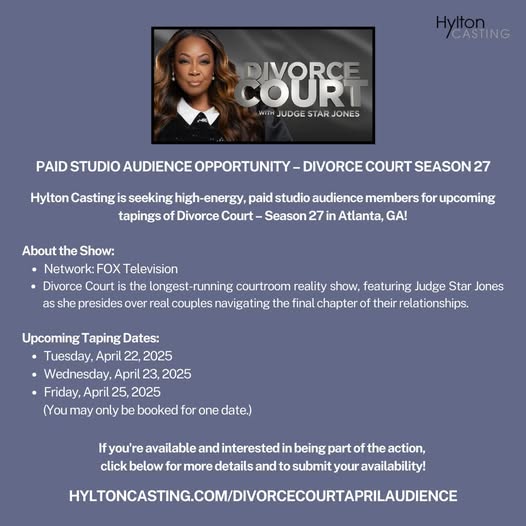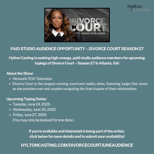 Hylton Casting is seeking high-energy, paid studio audience members for upcoming tapings of Divorce Court – Season 27 in Atlanta, GA!