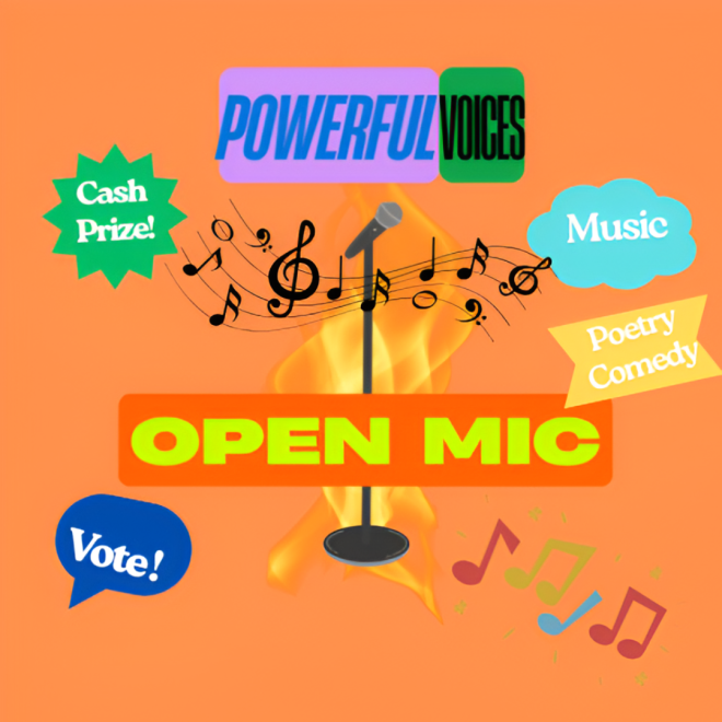 Join The Powerful Voices Open Mic Show for great vibes & a fun night of celebrating talented individuals through music, comedy, poetry, and more!