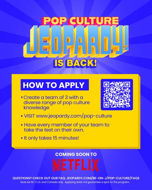 Aspiring contestants can apply now by forming a team of three with a wide range of pop culture strengths. Each team member must take a short 15-minute test individually to qualify. Applicants must be 18 or older and reside in the U.S. or Canada.