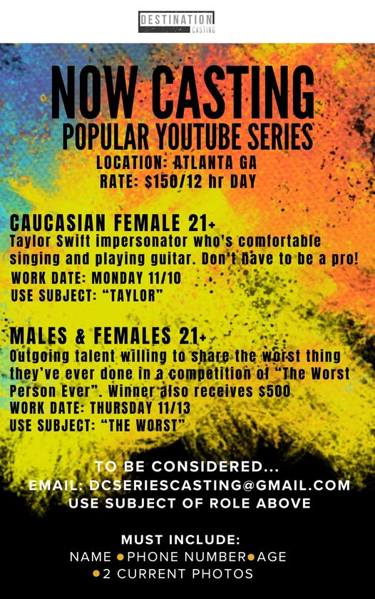 Now Casting fun & vibrant people for popular YouTube series in Atlanta!