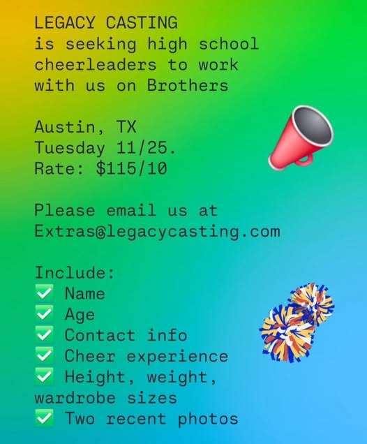 Legacy Casting is currently seeking real high school cheerleaders for an exciting opportunity to appear in the upcoming feature film Brothers, filming in Austin, Texas.