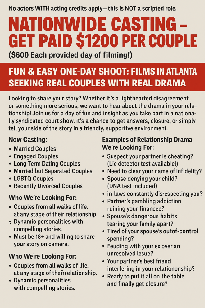 Casting is now open for a nationally syndicated, unscripted court-style show filming in Atlanta! This is a one-day shoot featuring real couples with real relationship drama. Furthermore, no acting experience required or accepted. The production is looking for people ready to speak their truth, share their side of the story, and possibly find answers, resolution, or closure.