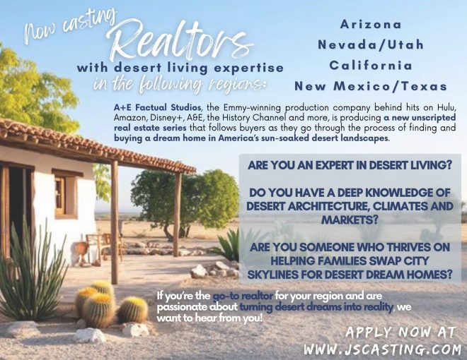 Producers are looking for realtors with deep expertise in desert living who can guide buyers through the unique challenges and rewards of desert homes. The series will showcase professionals in regions including Arizona, Nevada, Utah, California, New Mexico, and Texas, as they help families trade city skylines for serene, sun-soaked desert escapes.