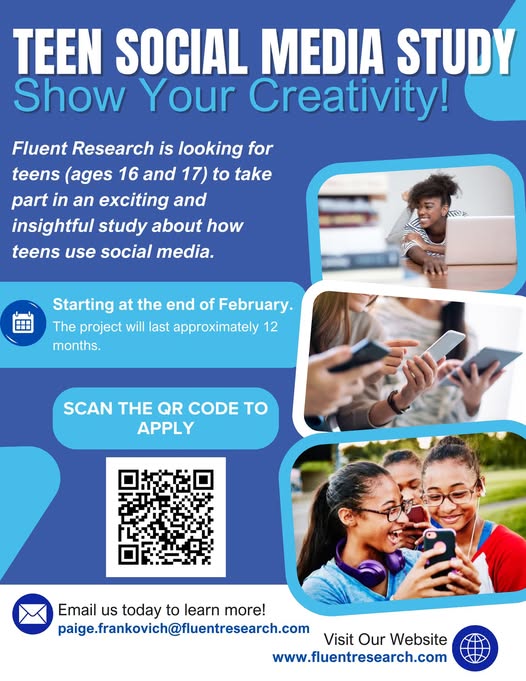 A producer at Fluent Research, a New York City-based firm specializing in data and insights, is seeking creative and social media-savvy teens (ages 16 & 17) for a research study on teen social media usage.
