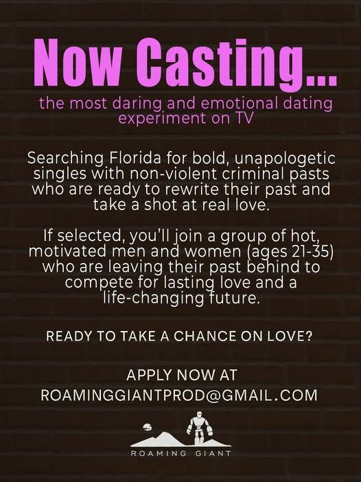 A new reality dating show is searching throughout Florida for bold and unapologetic singles who are ready to rewrite their past and take a shot at true love. This one-of-a-kind social experiment is designed for individuals with non-violent criminal pasts who refuse to let their history define them. If you’re ready to leave the past behind and embrace an exciting, life-changing opportunity, this could be your chance.