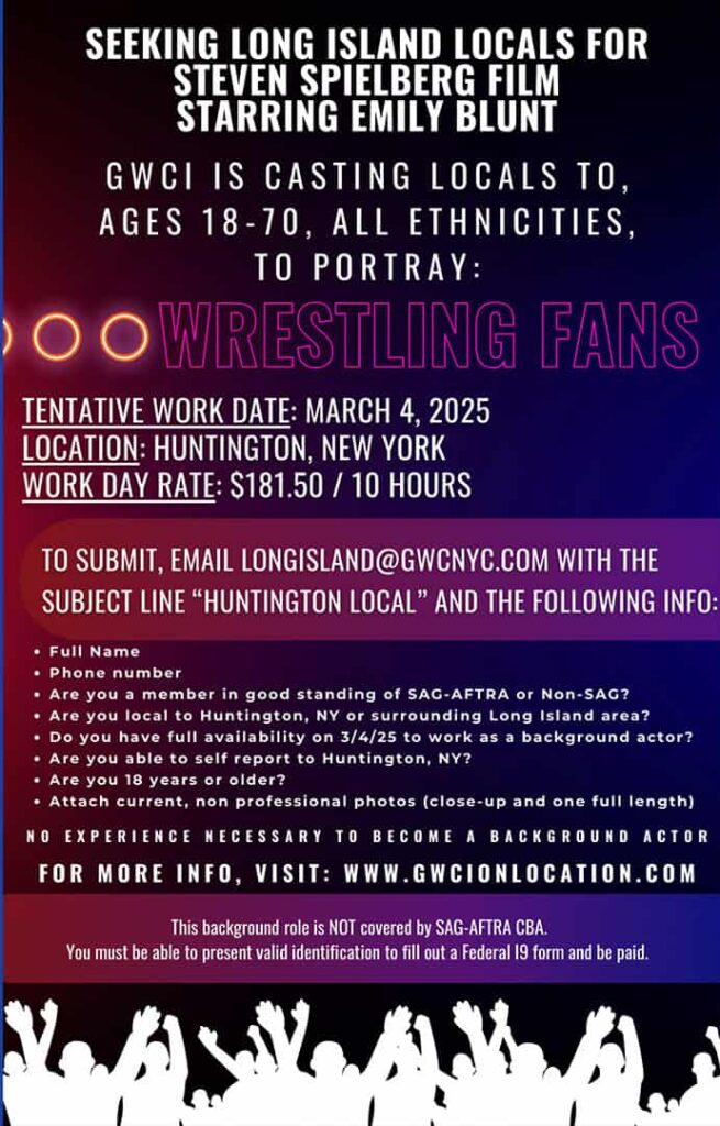 A casting call has been put out for anyone from 18 to 70 years old to portray wrestling fans on March 4 in Huntington.