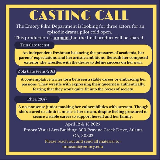 The Emory University Film Department is casting for a student-produced cold open of an original episodic drama pilot titled Lifin’. This is a non-paid opportunity; however, all cast members will receive a copy of the final scene for personal and portfolio use.
