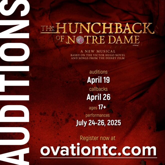 Audition registration is officially open for Ovation’s summer musical production of The Hunchback of Notre Dame! Performers ages 17 and up are invited to audition for either a lead onstage role, a featured choir role, or to be considered for both.