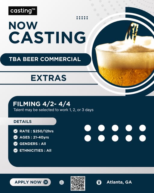 Casting TaylorMade is currently seeking extras for an upcoming beer commercial filming in Atlanta, GA, from April 2nd to April 4th. Selected talent may be required for one to three days, depending on the client’s needs.