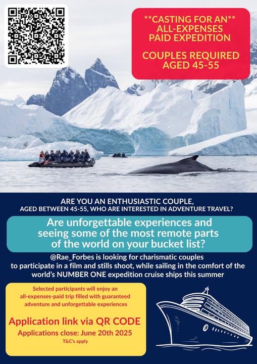 A casting opportunity for UK couple who believe they are thrill-seeking travelers: A leading UK-based casting director is currently searching for an adventurous couple to star in a new reality TV project set aboard a world-renowned expedition cruise.