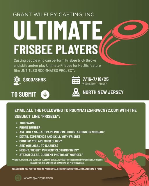 Grant Wilfley Casting, Inc. is now casting Ultimate Frisbee players and individuals with impressive Frisbee trick skills for the upcoming Netflix feature film, currently titled the Untitled Roommates Project.