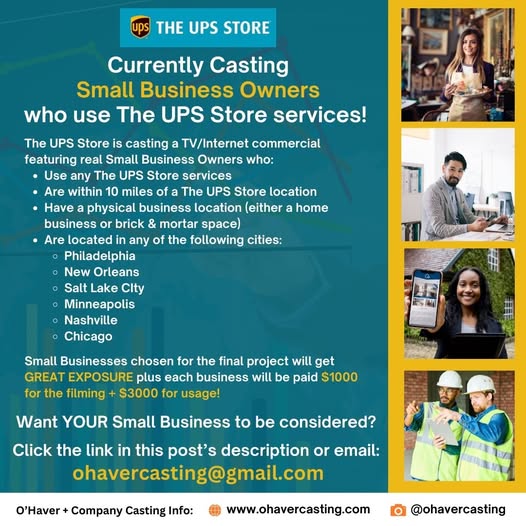 Any Philly, New Orleans, Salt Lake City, Minneapolis, Nashville or Chicago actors/non-actors have a small business (or do you know of someone who may be interested)? We are seeking Small Business Owners who use The UPS Store for their business! Want some GREAT EXPOSURE for you business and get paid too?
