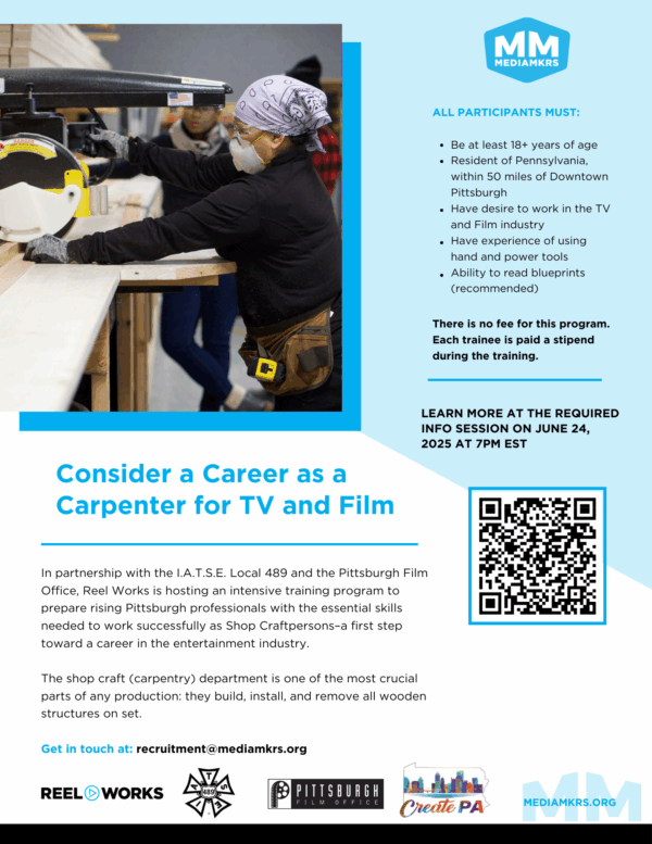 The Pittsburgh film office with the local entertainment trade union & Reel Works, is looking for carpenters who would like to join the film industry as set craftspeople.