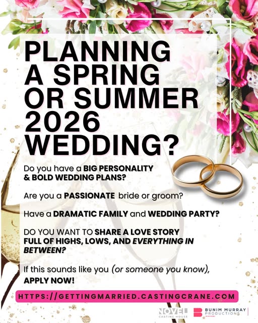 Casting call for a new television series following engaged couples as they make their way from proposal to wedding day. This currently unnamed show will focus on real couples planning Spring or Summer 2026 weddings.
