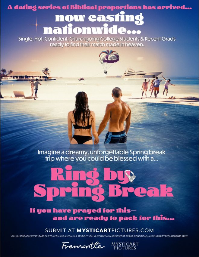 Imagine a dreamy, unforgettable spring break trip where you could be blessed with a ring by spring break!Now auditioning single, hot, confident, churchgoing college students and recent grads!