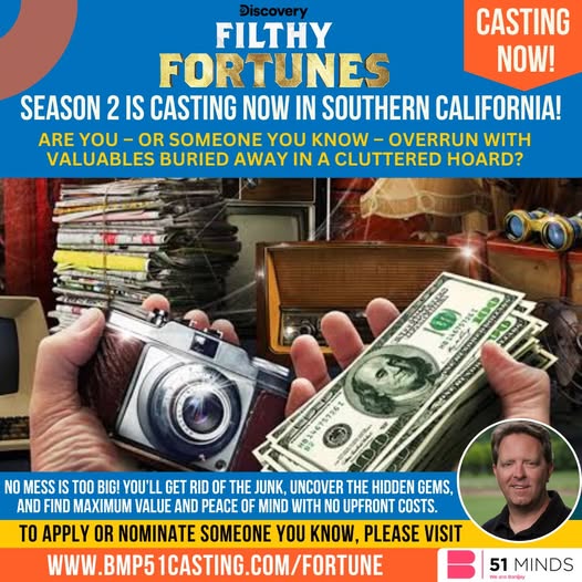 Have ever looked at a crowded garage, packed storage, or a home with lots of belongings? Have you wondered if any of it might actually be worth something? This could be your opportunity to find out on national television. Discovery’s hit series Filthy Fortunes is now casting for its second season in Southern California.