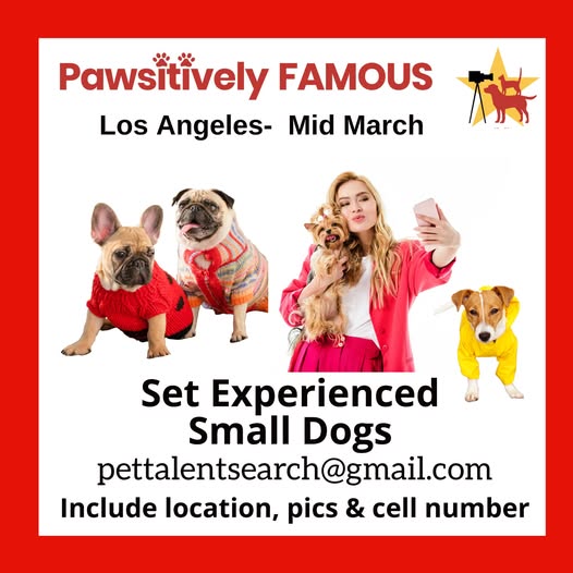 Must have full availability that weekNow casting small well trained dogs for a commercial project in Los Angeles. Prior on-set experience is required, and dogs must be comfortable working in a professional studio environment.