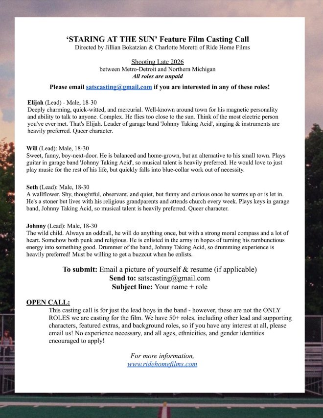 This casting call is for just the lead boys in the band – however, these are not the ONLY ROLES we are casting for the film. We have 50+ roles, including other lead and supporting characters, featured extras, and background roles, so if you have any interest at all, please email us! No experience necessary, and all ages, ethnicities, and gender identities encouraged to apply!