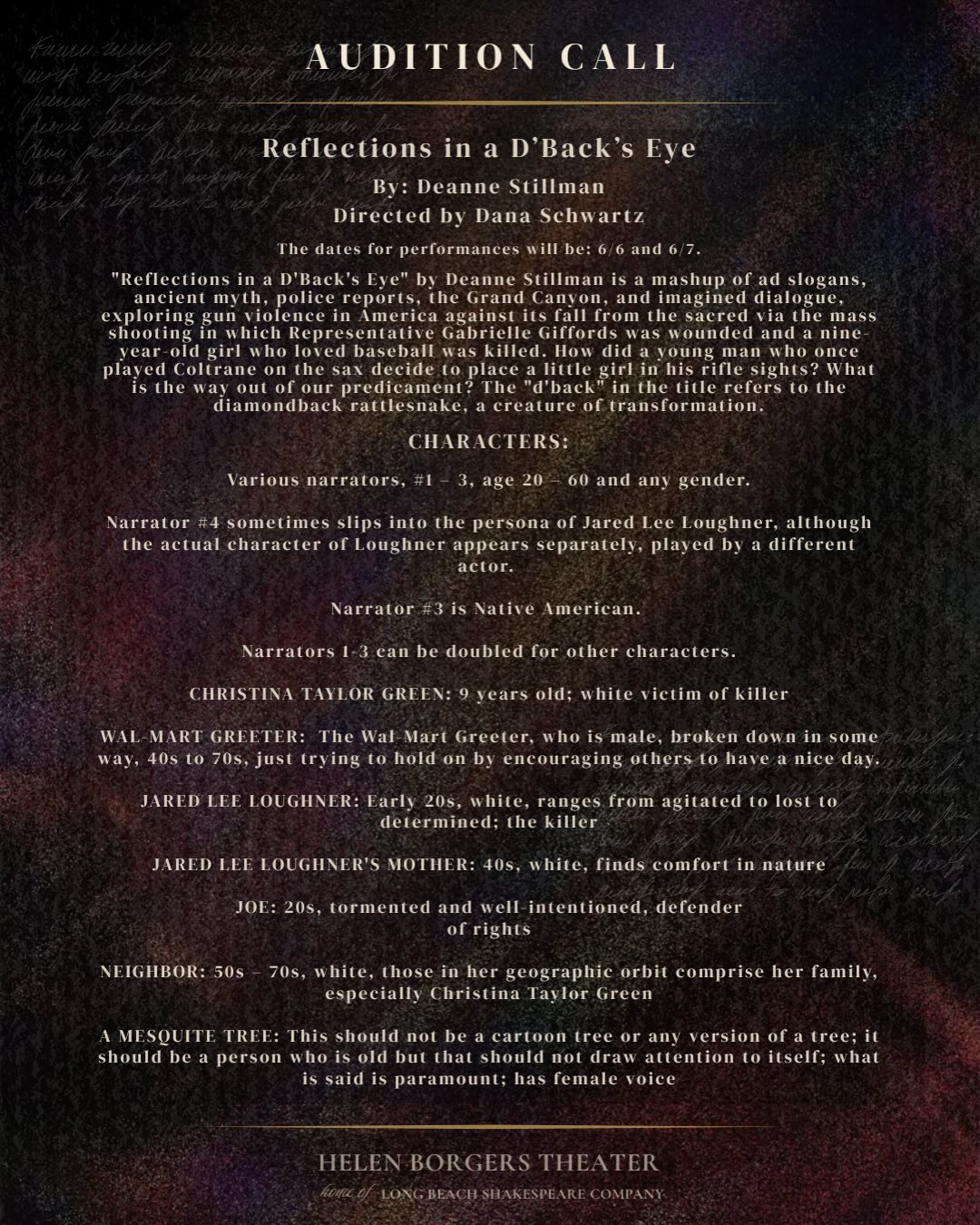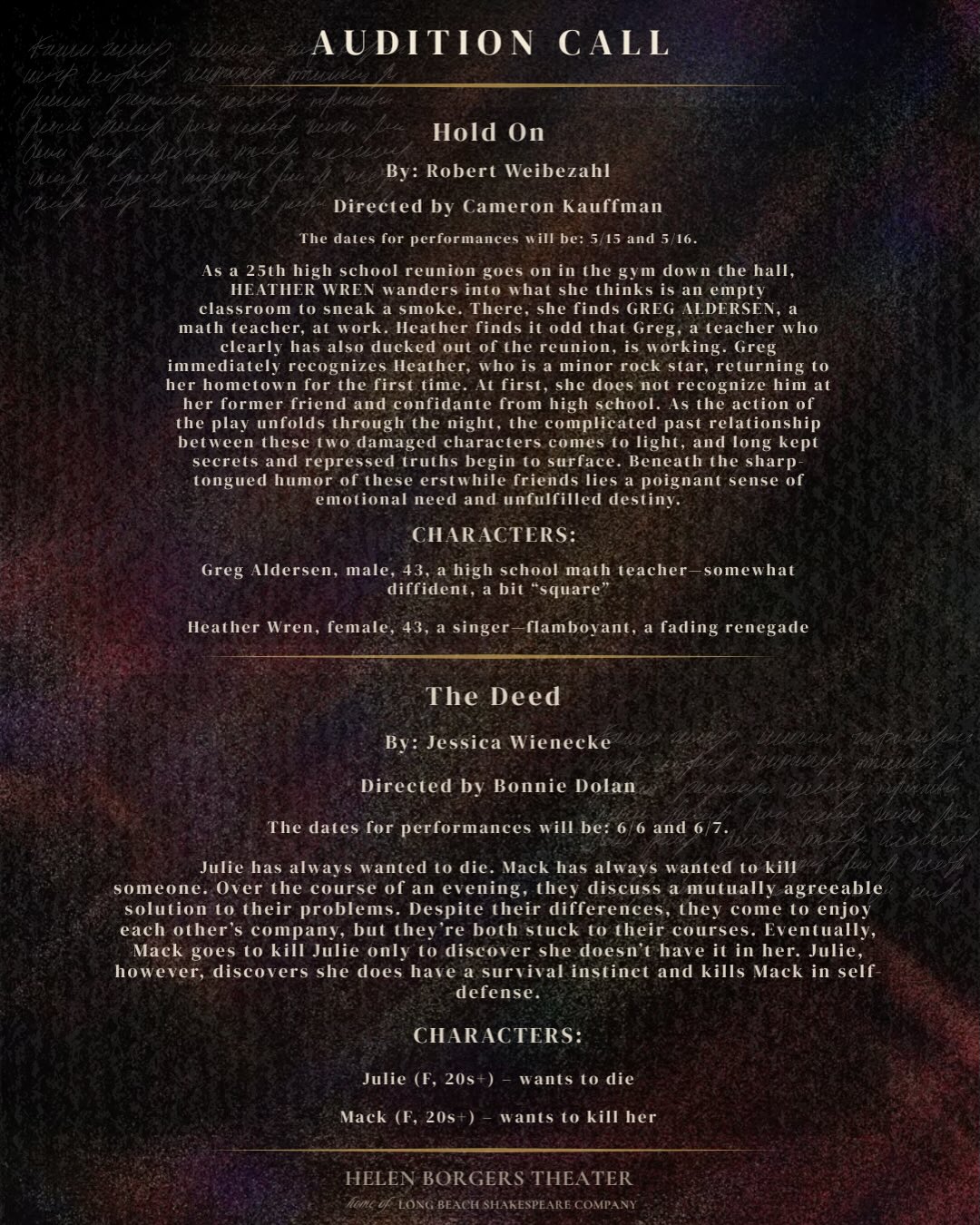 Be part of that celebration and audition to be in our May and June New Works! Auditions are due by Sunday, April 19 – We can’t wait to see your tapes!