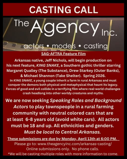 Arkansas native, Jeff Nichols, will begin production on his next feature, KING SNAKE, a Southern gothic thriller starring Margaret Qualley (The Substance), Drew Starkey (Outer Banks), & Michael Shannon (Take Shelter). Spring 2026.