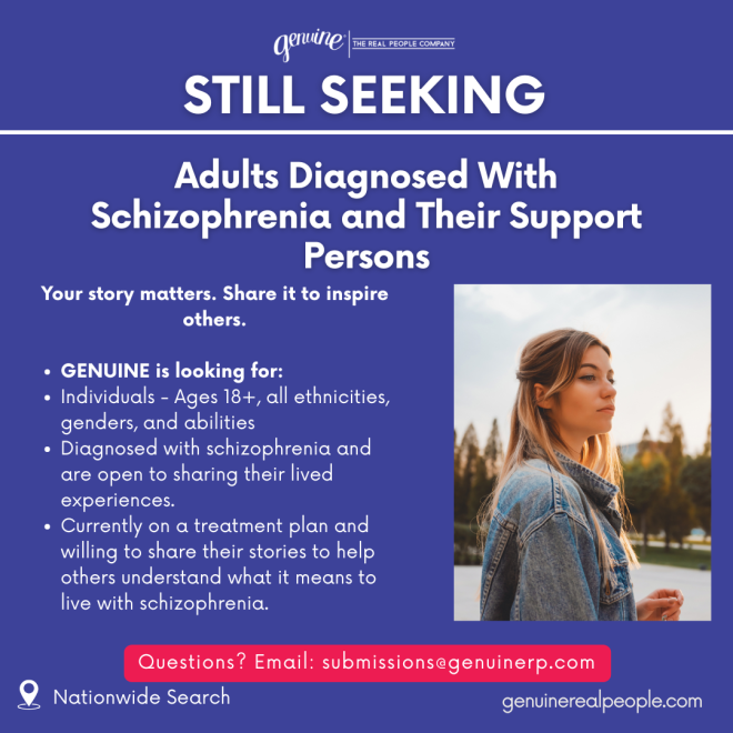 The project seeks individuals aged 18 and older, of all ethnicities and gender identities, who are willing to authentically share their experiences living with schizophrenia. Care partners — including family members, friends, or loved ones who support someone with schizophrenia — are also encouraged to apply.
